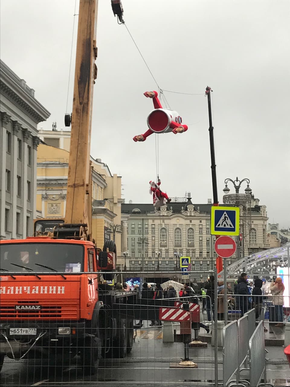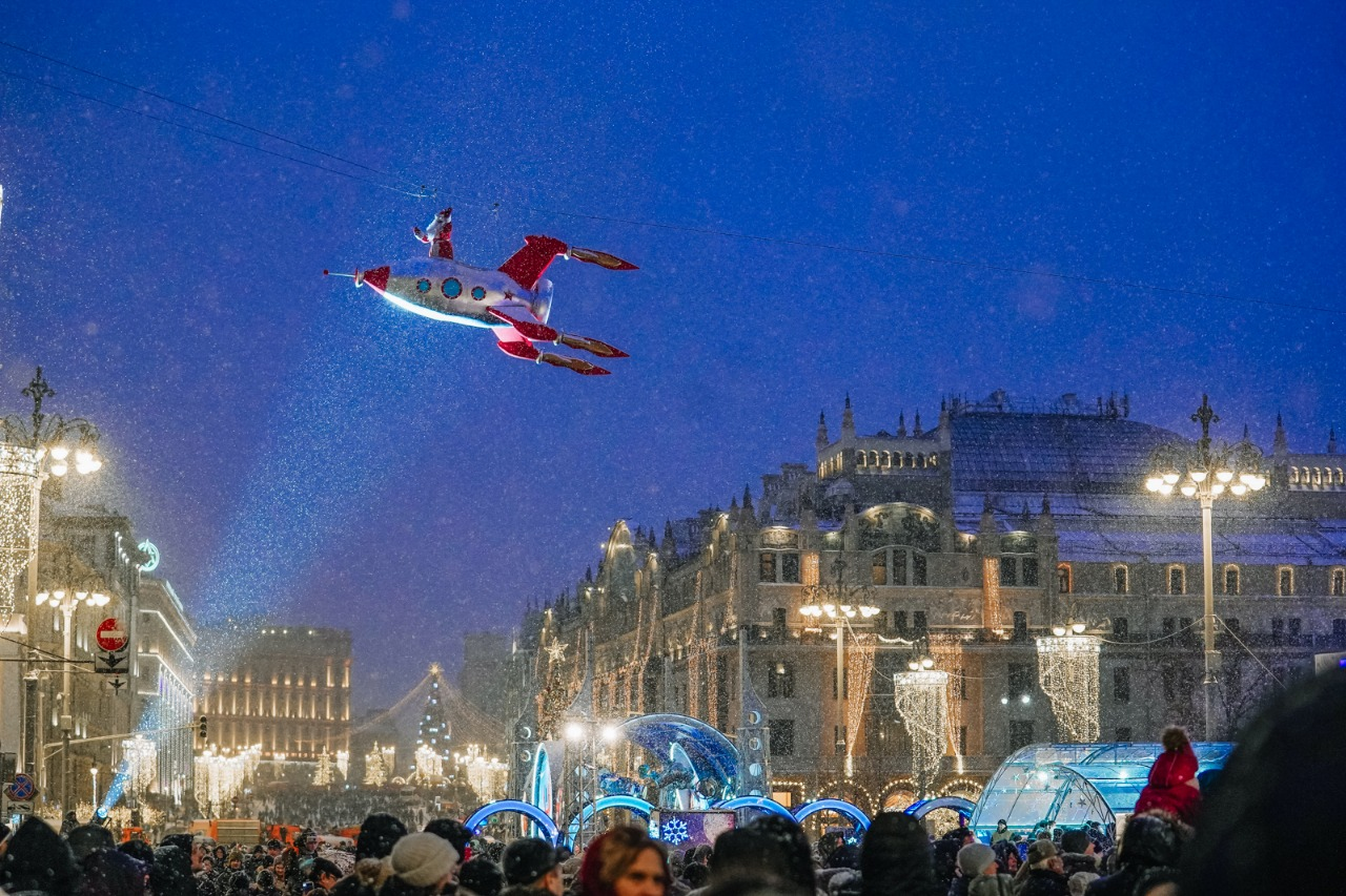 Компания “Московские сезоны” привлекает нас в качестве экспертов и организаторов нестандартных проектов, требующих творческого подхода и высокой степени безопасности. Одним из таких проектов была Ракета на новый год 2019 1020 перед большим театром. Нам была поставлена задача: ЧТО непрерывно на протяжении 3х суток ракета должна летать в пространстве на уровне 6 этажа, над людьми гуляющими по театральному проезду. В ракете должен находиться актер, имеющий допуск на высотные работы в костюме деда мороза и поздравлять всех с новым годом! Командой «дедов морозов», среди которых была даже одна девушка, поставленная задача была выполнена с соблюдением всех требований и норм безопасности.