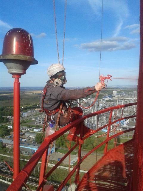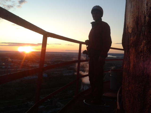 Данная работа начинается с подъема краски и оборудования на технические площадки. Вес краски составлял порядка 800 кг. Каждое утро начиналось с разминки, ведь подъем на трубу по пожарной лестнице занимал порядка часа. Так же свои коррективы вносит погода, порой приходилось работать за облаками. Благодаря четкой организации и продуманному плану выполнение этого проекта заняло 10 рабочих дней силами 4х человек.