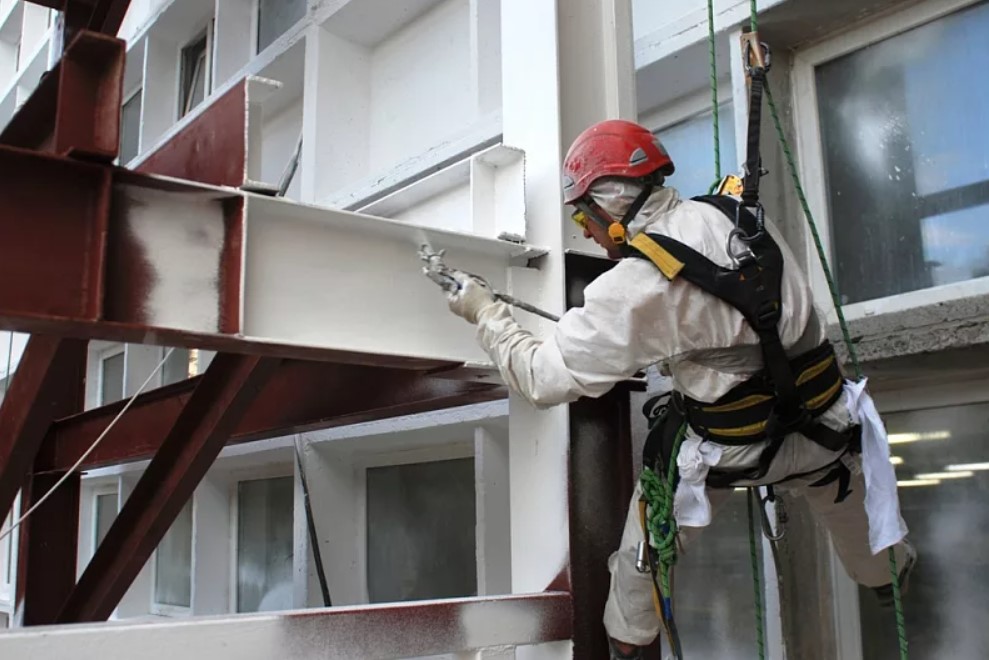 - Покраску на всех уровнях, в т.ч. без альпинистского снаряжения. Вам не придется вызывать промышленных альпинистов отдельно для верхних участков стен и потолков, и обычных маляров для работ внизу.