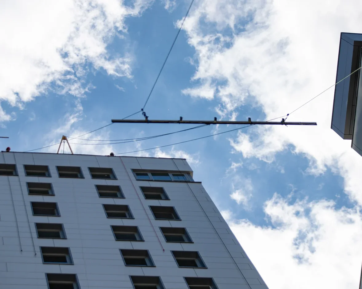 Вот он день подъема, монтаж грузоподъёмной линии, ее проверка и доработка заняла один день. На второй день с утра приехала фура с грузом, подъём 6 элементов прошел в штатном режиме, ровно, гладко, по запланированному ранее плану, за один день, в тот же день были разобраны и спущены все вспомогательные приспособления. Одним из элементов была рама со стеклопакетом была весом 700 килограммов и длинной 8 метров.